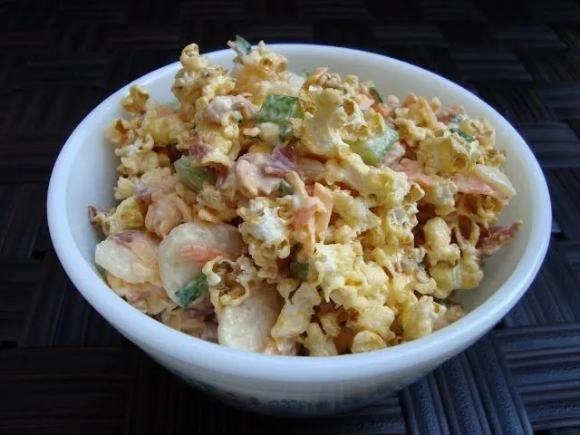 Now before anyone gets all huffy and says that the words “popcorn” and “salad” should never appear side by side, let me remind you that popcorn is a whole grain. So this salad is extremely healthy, as long as you don’t count the mayonnaise, cheese or bacon.