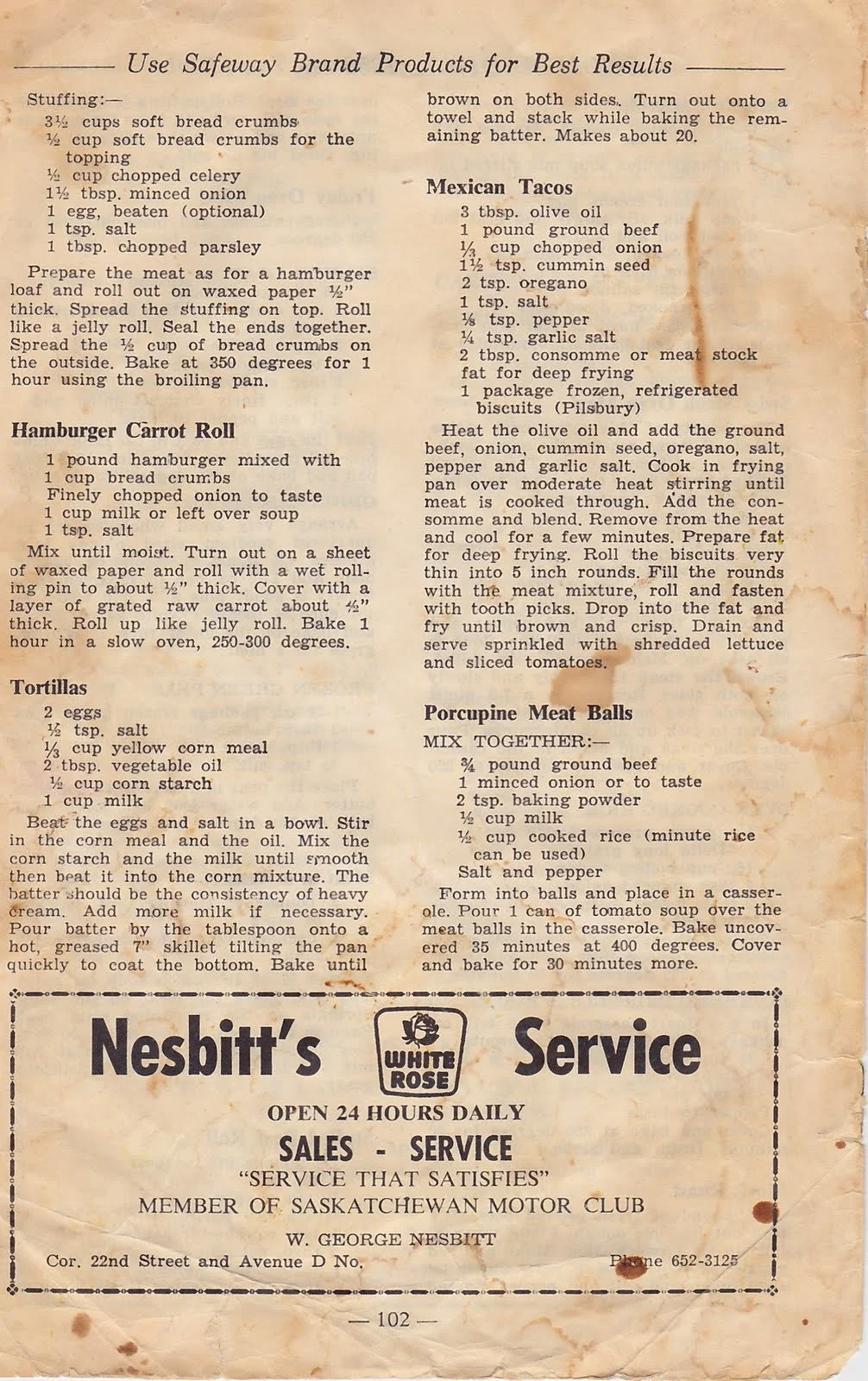 Source: CKOM 1250 on Your Dial in Saskatoon. Sadly, it's coverless, but here's the page with the recipe. Any bets on whether Nesbitt's Service is still in business?