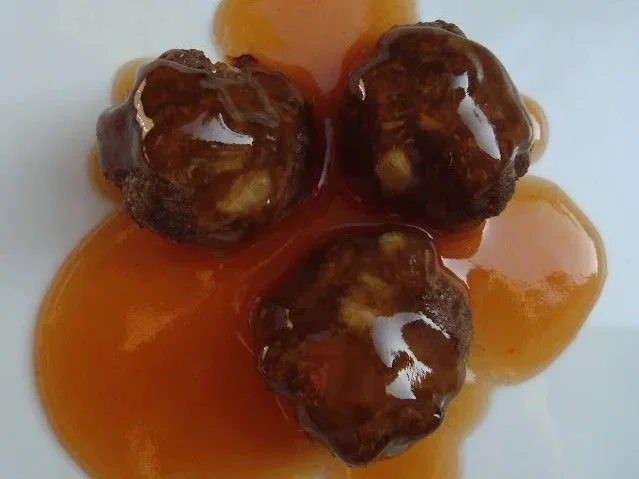 The meatballs are made with ground beef, egg, breadcrumbs, parmesan cheese, etc. and baked in the oven. Pretty standard. The sweet and sour sauce though, is pure caker: