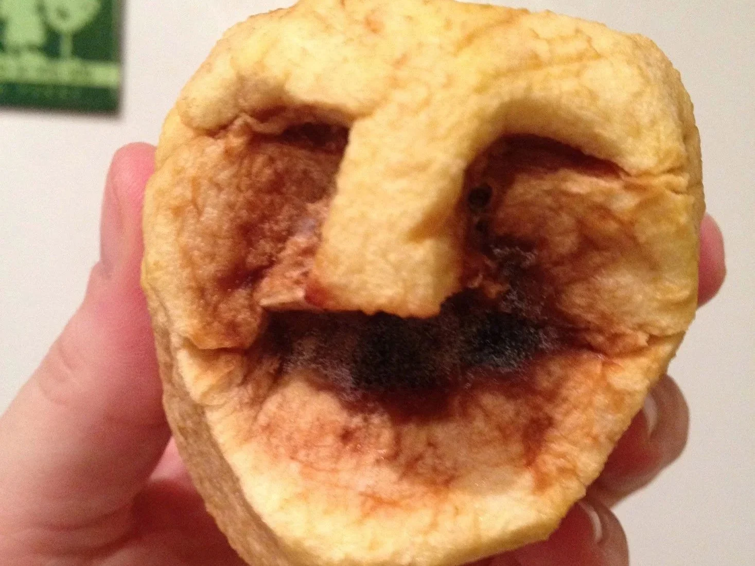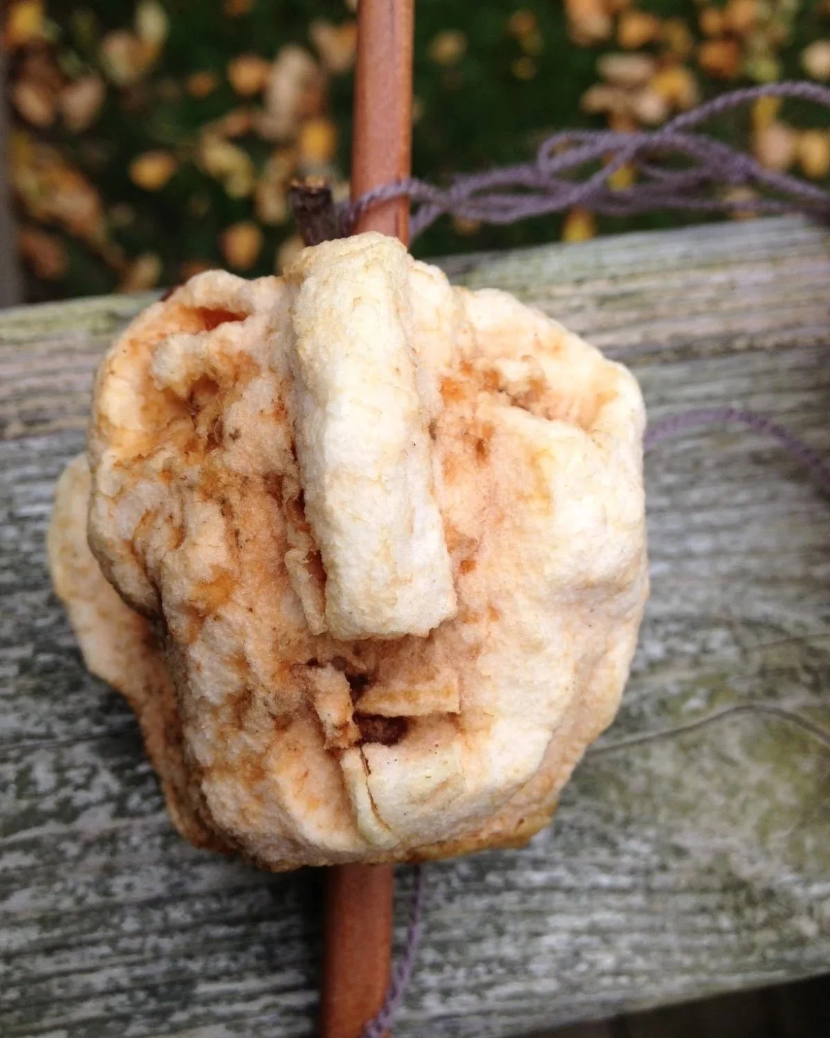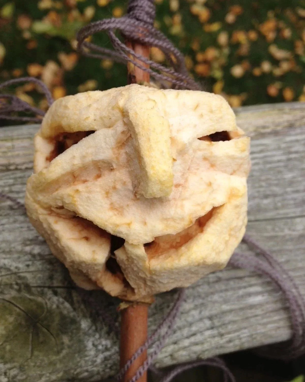 Note from the apple artiste: In an attempt to speed up the drying process, I used my oven, on low heat. It seemed to be working until my betrothed turned on the oven to make chicken fingers and ended up baking my apple head.