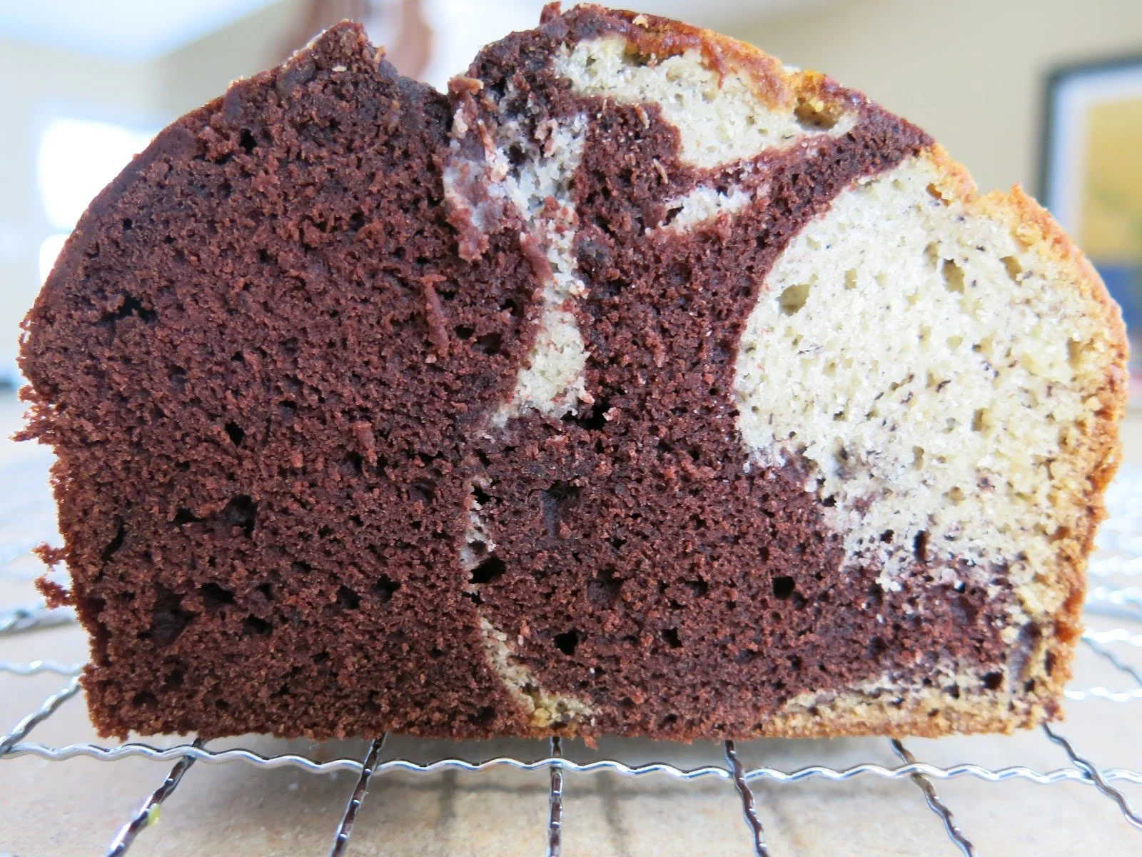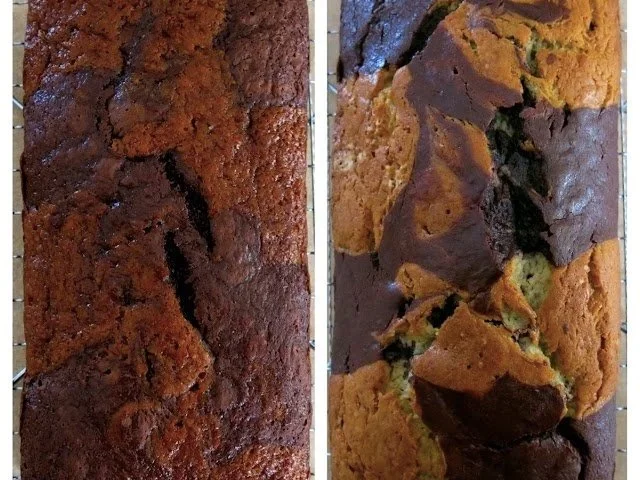 Drop alternating spoonfuls of dark and light batters into the prepared pan, then marbleize by using a spoon to gently turn the batter over in 3 places down the length of the pan.
