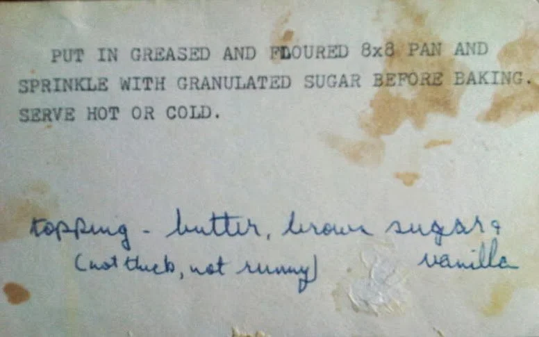 Put in greased and floured 8 x 8 pan and sprinkle with granulated sugar before baking. Serve hot or cold.