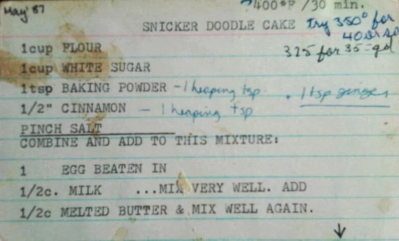 Okay, I made that up. There’s no Mr. Snicker Doodle. But thankfully, there is Snicker Doodle Cake, named after, oh, who the hell knows? Truthfully, I’d forgotten all about it until Caker Cooking reader and fellow blogger Debra emailed me her mother’s typed recipe, along with some of her own adjustments. I made the original, but I’m sure Debra’s revised version is just as good.