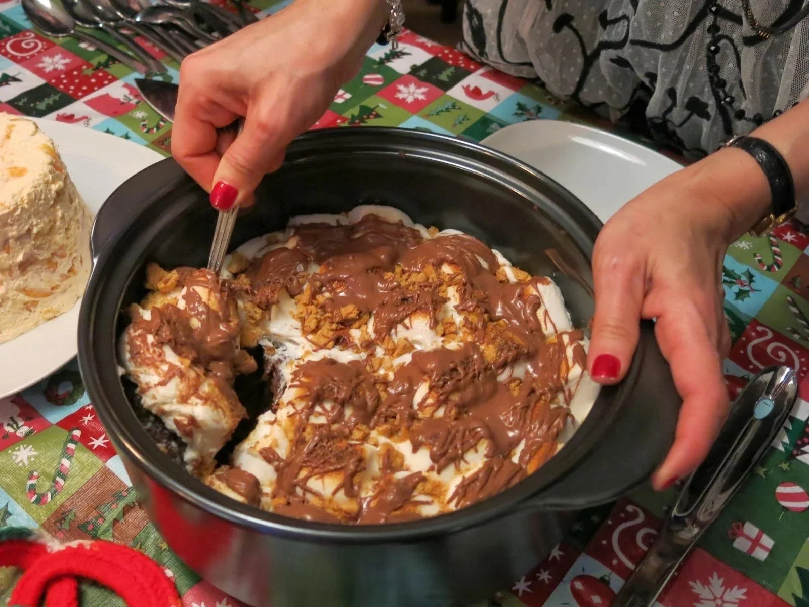 This party guest said she got the recipe when she bought her slow cooker. I don’t have the recipe, but it looks like you bake a cake in a slow cooker (Why would anyone want to bake a cake as slowly as possible?), toss some marshmallows and graham crackers on top and drizzle with melted chocolate. I had s’more for breakfast.