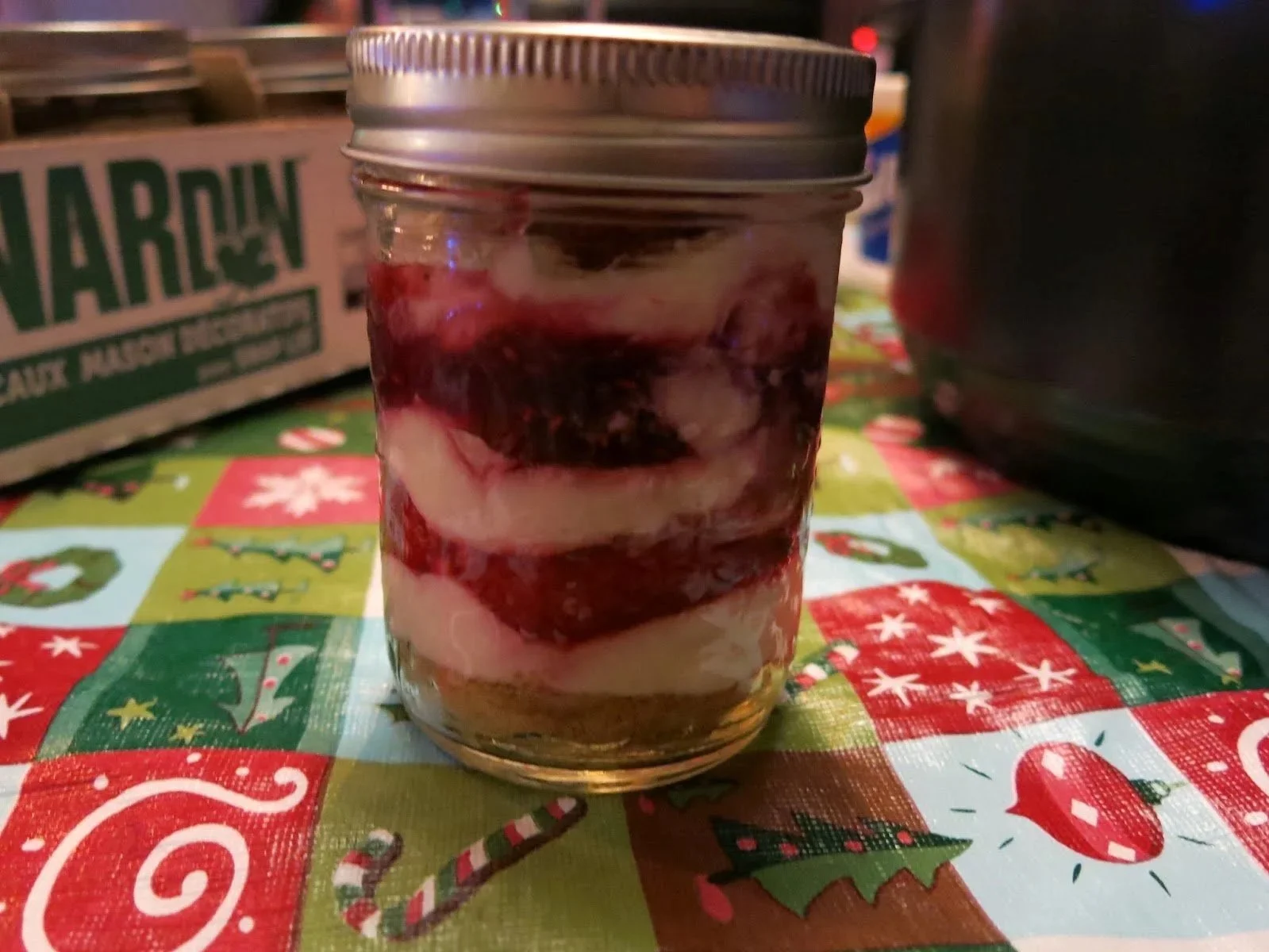 These were delicious! Only downside? You have to go out and buy the jars. I say forget that and just use your leftover soup cans. Make sure you wash them out first. Cheesecake + grey bits of mushrooms = bad holiday season.